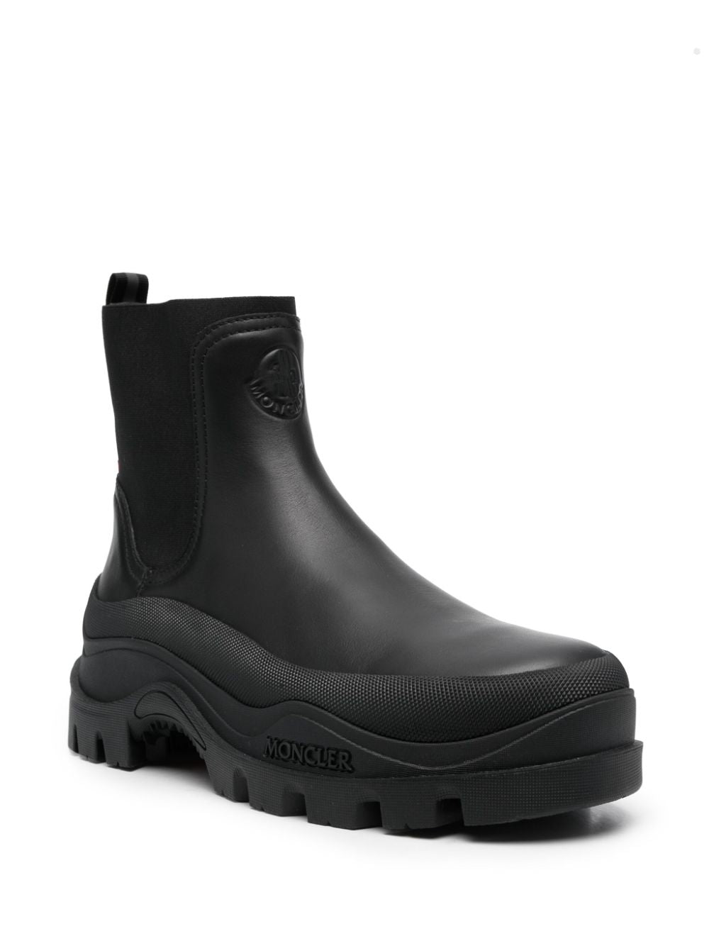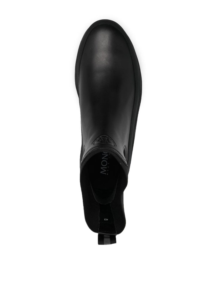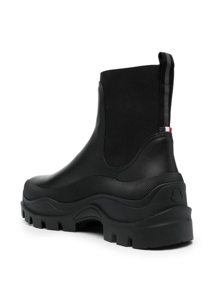 Stivale Moncler nero, modello Chelsea Laure, finitura idrorepellente, logo goffrato nella parte anteriore, pannelli elastici laterali, linguetta con logo sul tallone, suola in gomma.