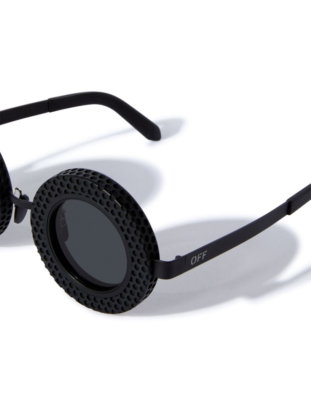Occhiali da sole neri Off-White, modello Chicago, montatura tonda, decorazione traforata, lenti grigie, stampa con logo nell'asta.