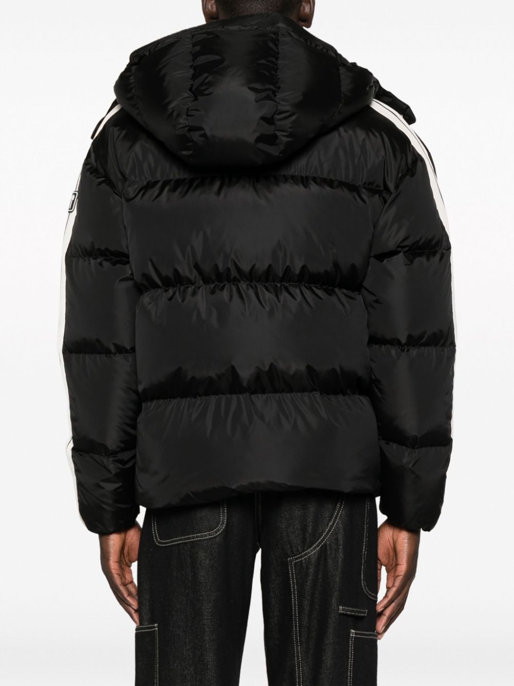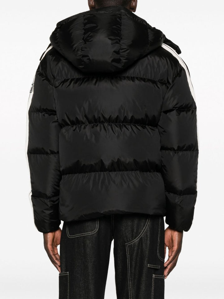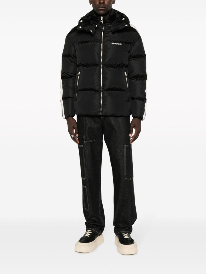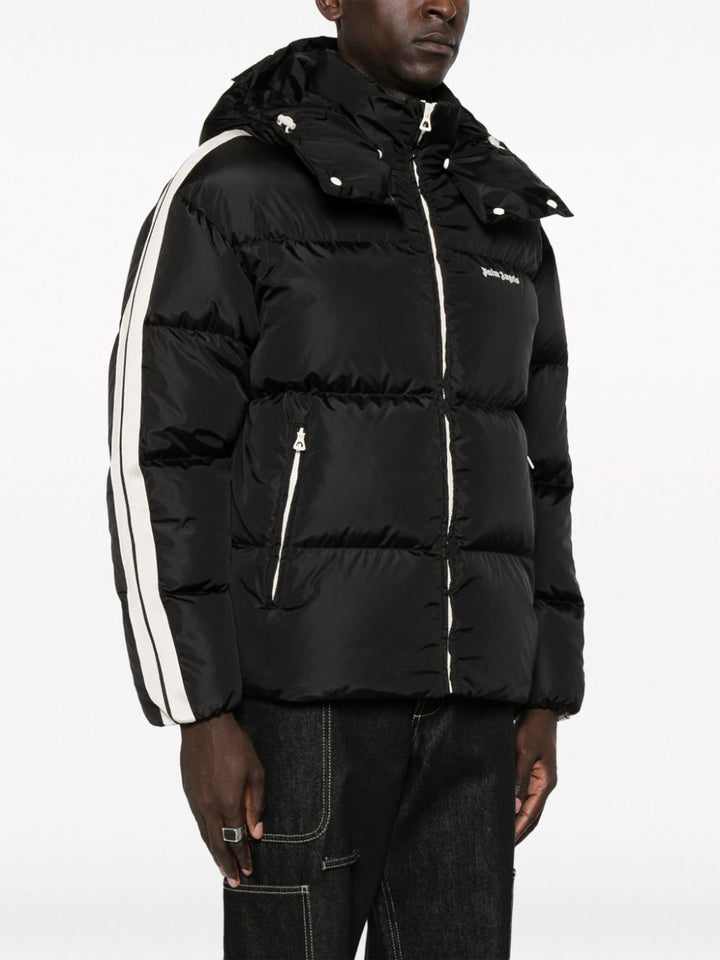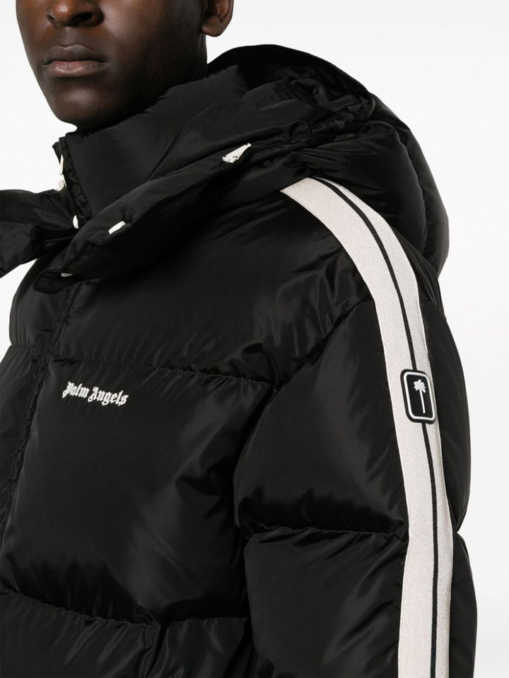 Piumino nero Palm Angels, design trapuntato con cappuccio removibile, bande laterali in contrasto, logo sul petto.