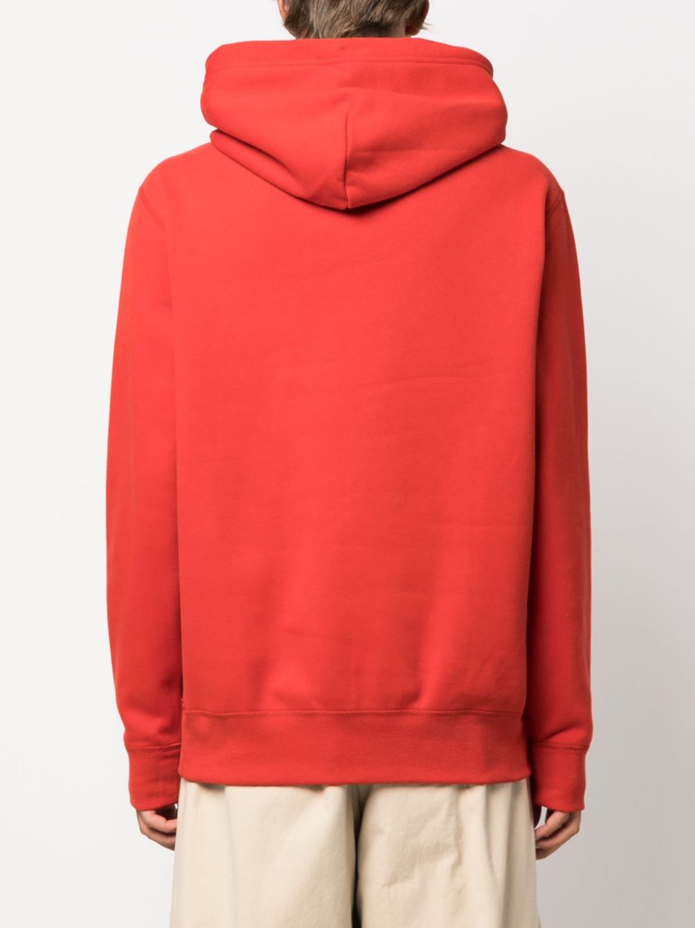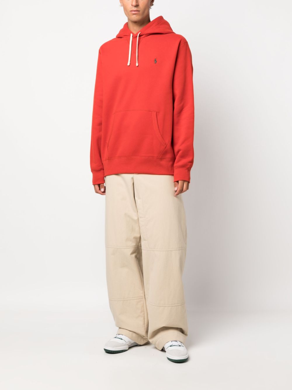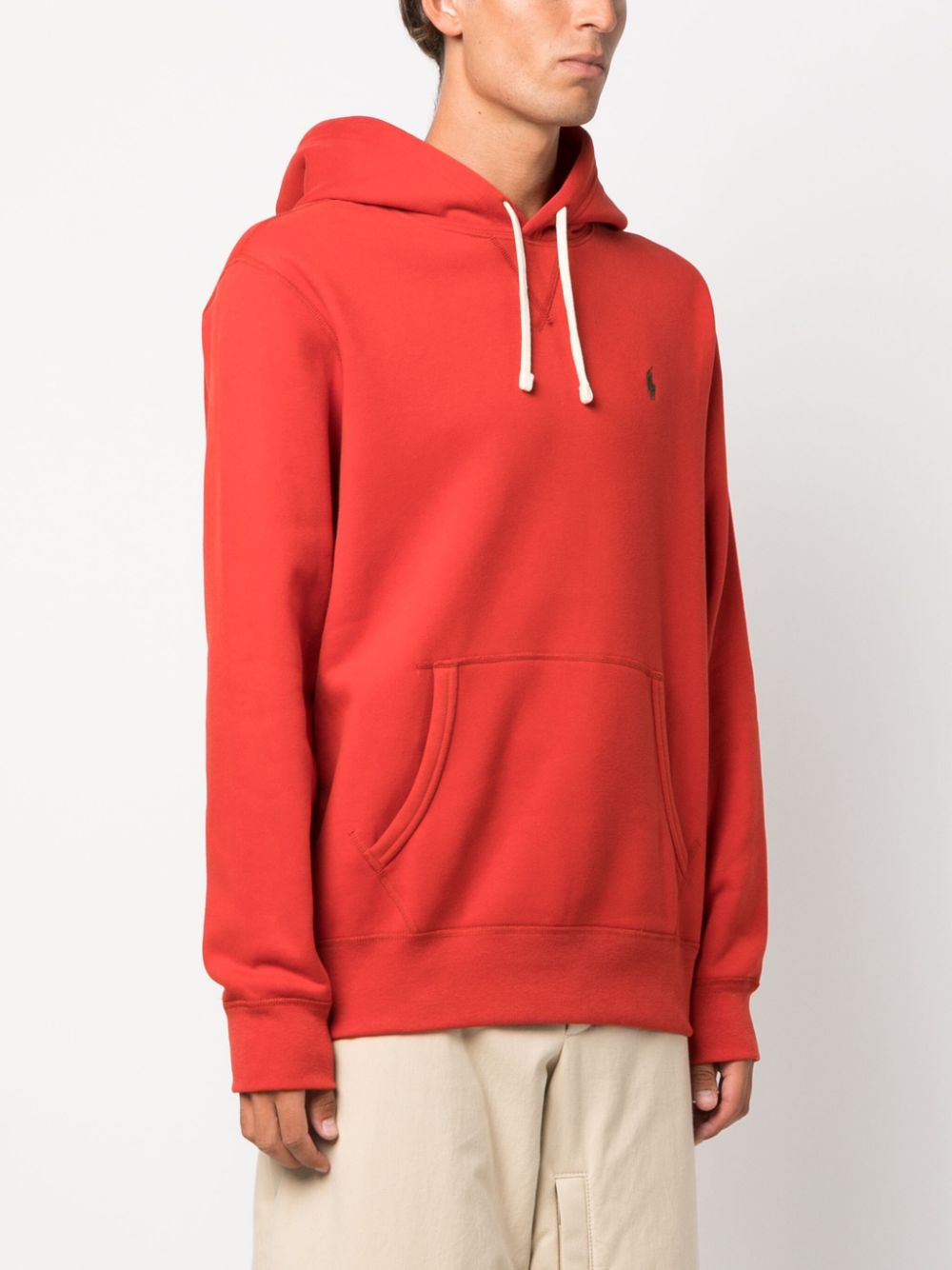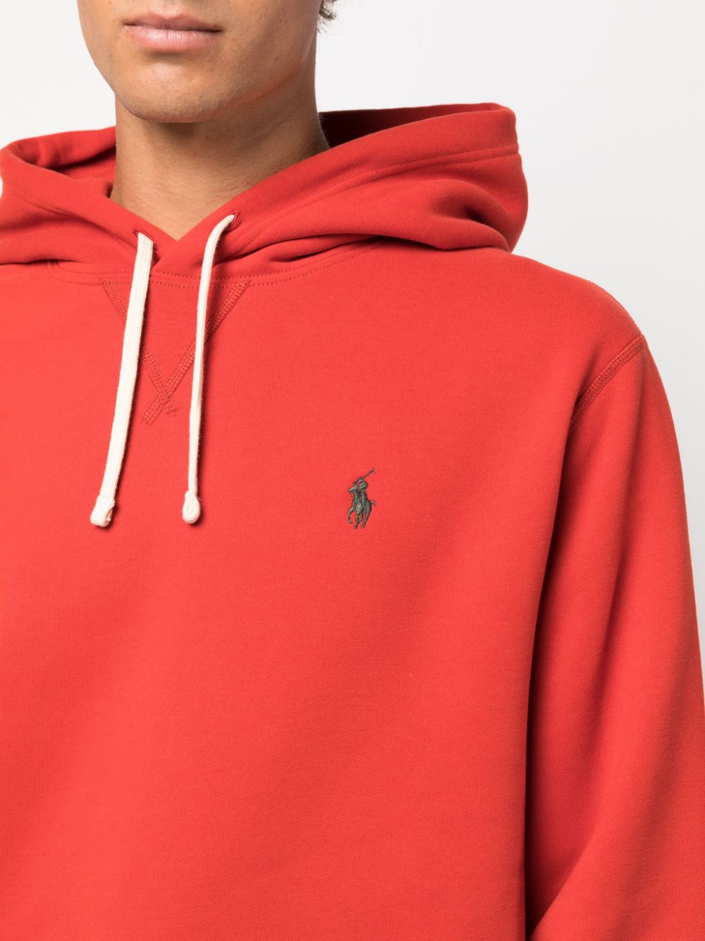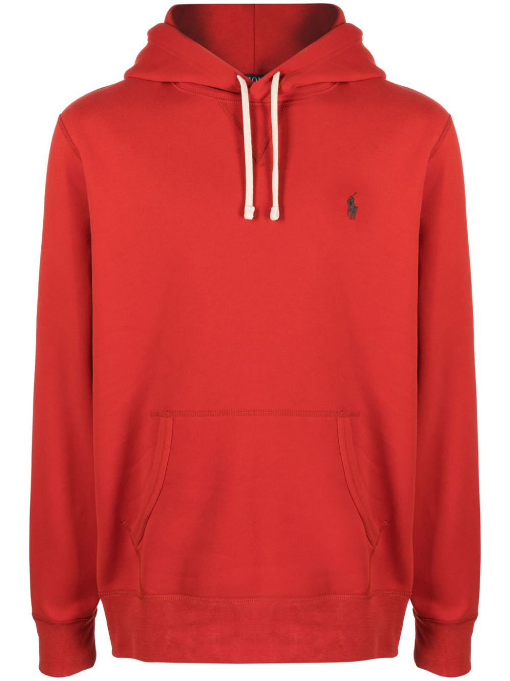 Felpa Polo Ralph Lauren rossa, con cappuccio e coulisse, tascone a marsupio frontale e logo ricamato in blu sul petto.