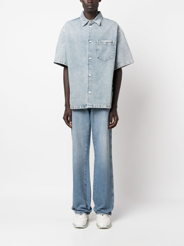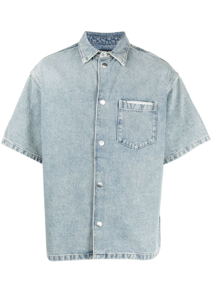 Camicia Purple Brand in denim, maniche corte, con taschino sul petto, colletto classico, abbottonatura frontale.