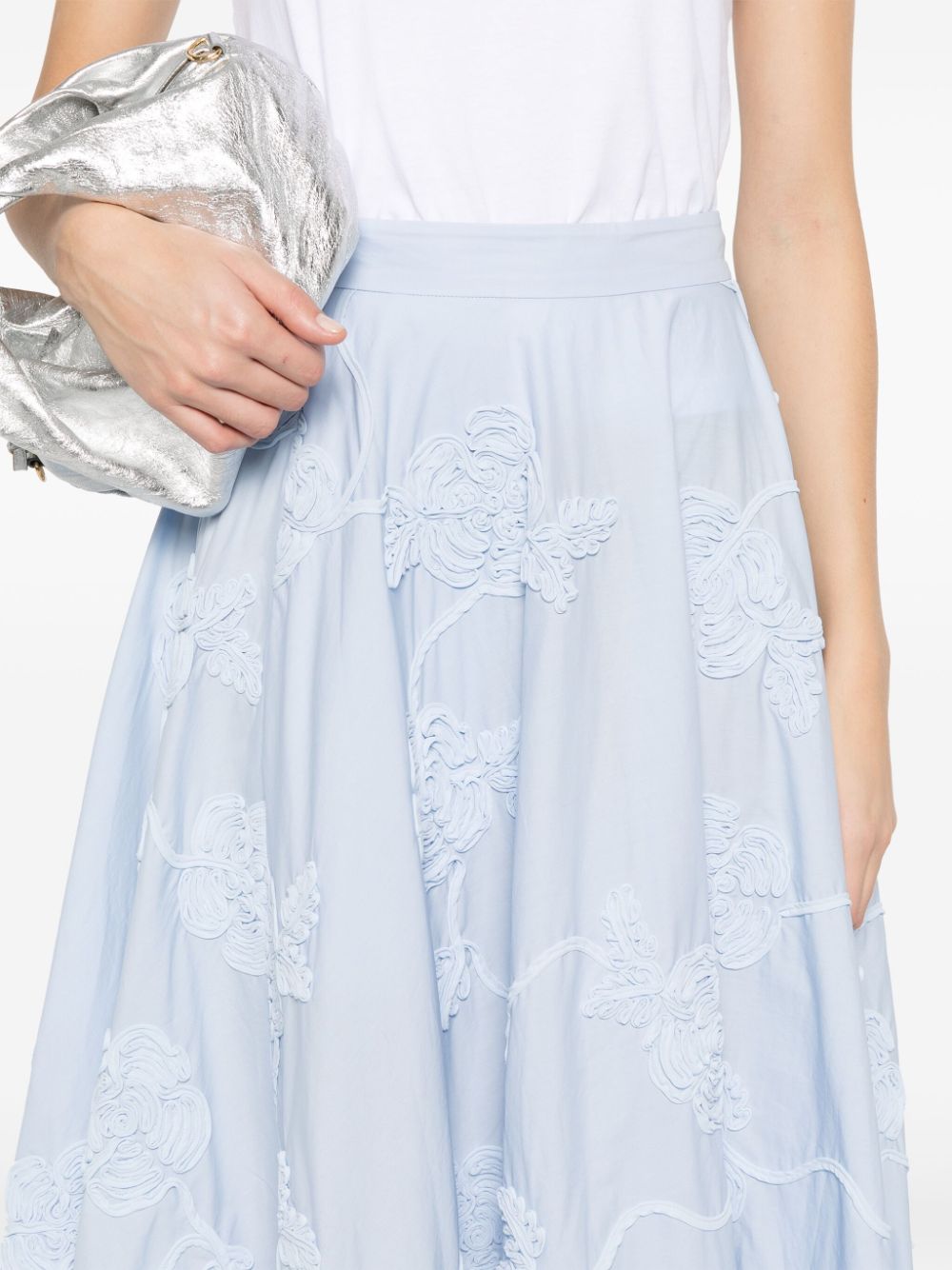 Gonna lunga con applicazione a fiori di Rotate colore azzurro cielo, chiusura laterale con zip e gancio nascosta, due tasche laterali a filetto.Composizione: Cotone biologico 100%