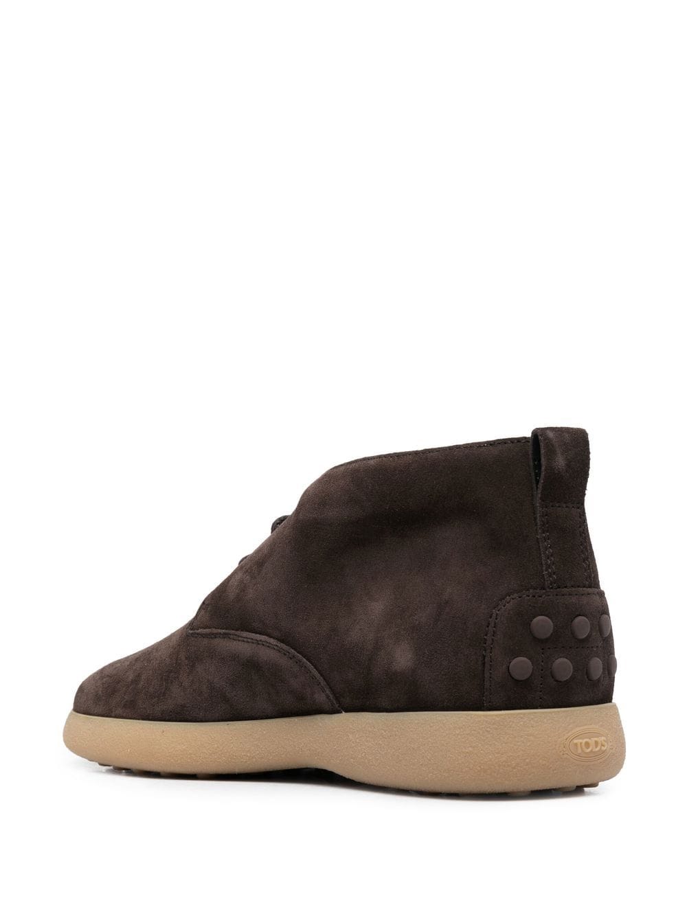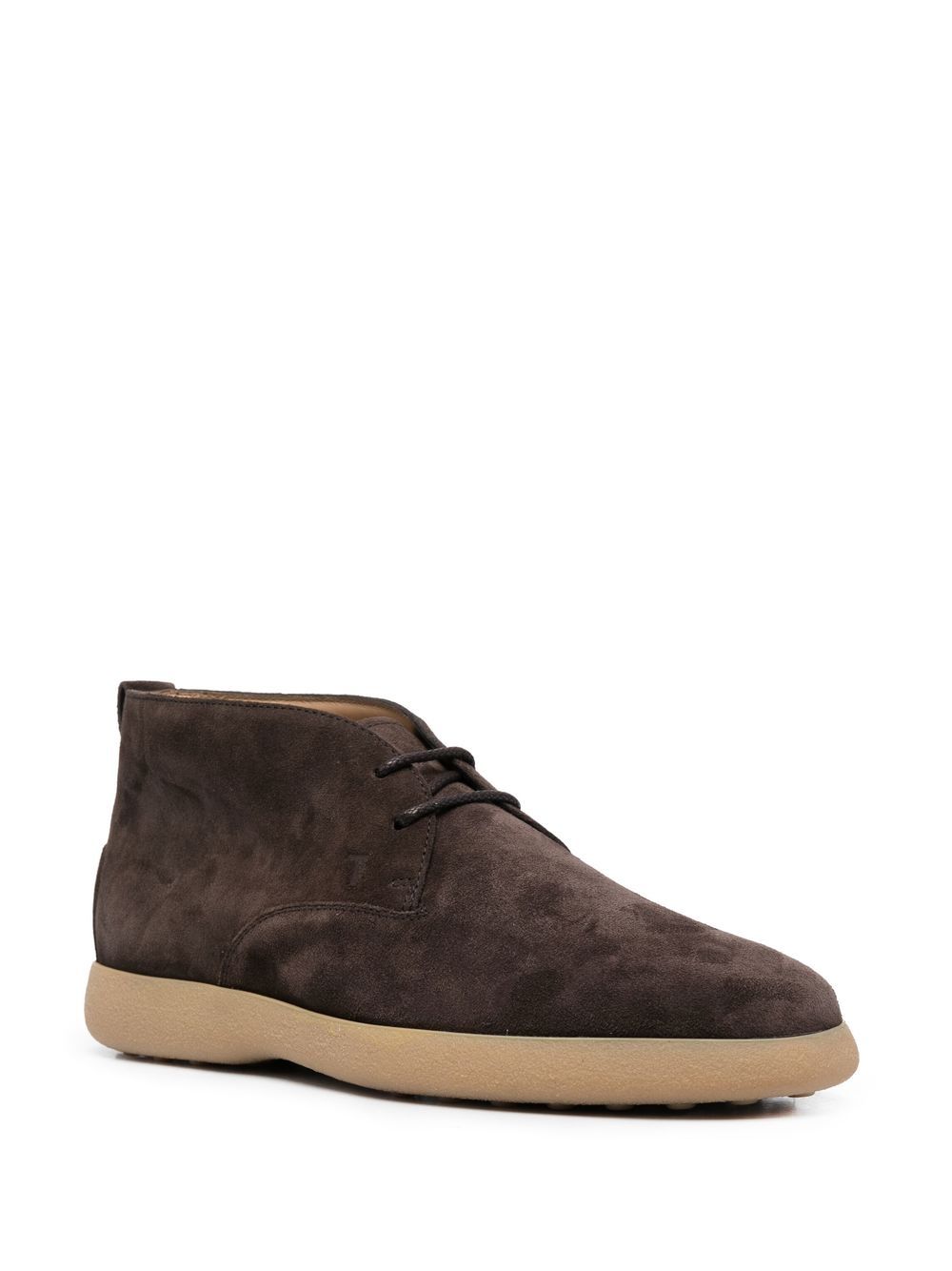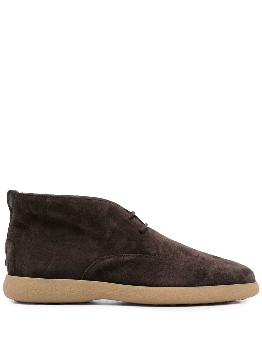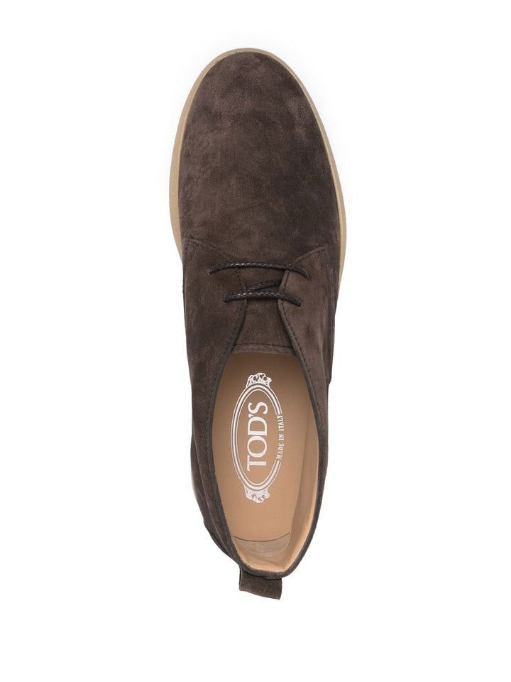 Polacchino Tod's in camoscio marrone, punta tonda, chiusura frontale con lacci, suola in gomma beige.