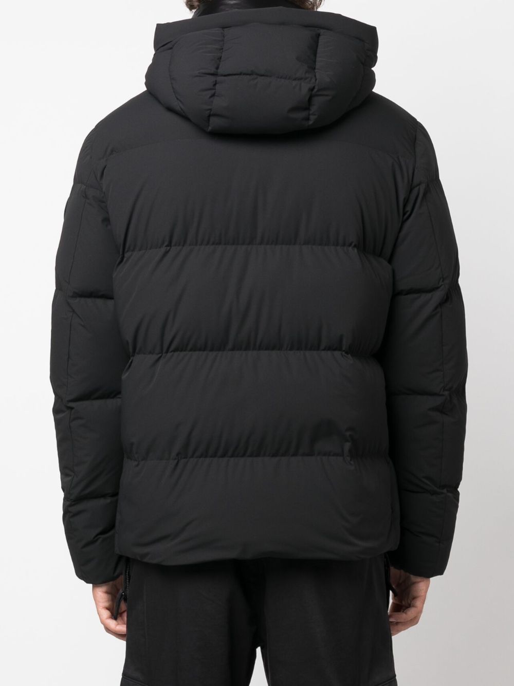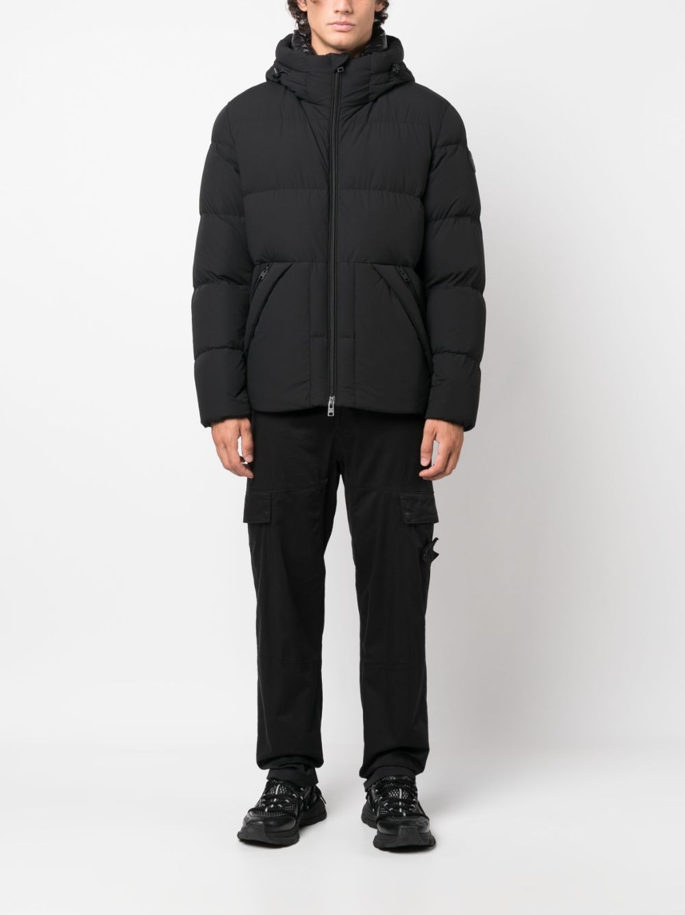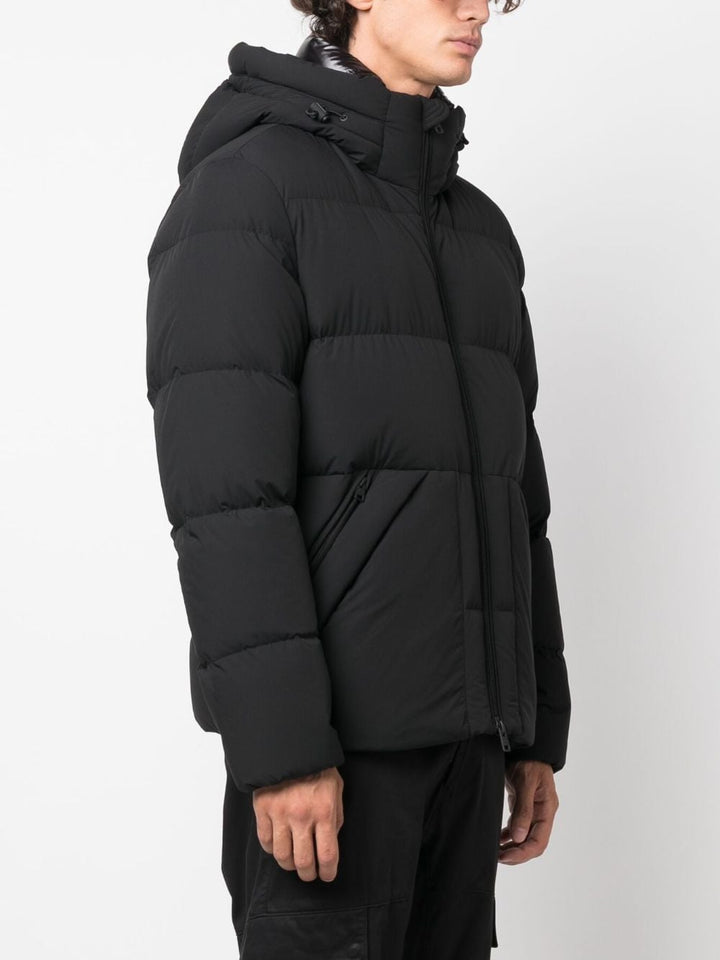 Piumino nero di Woolrich, design trpuntato, con cappuccio e tasche laterali con cerniera.